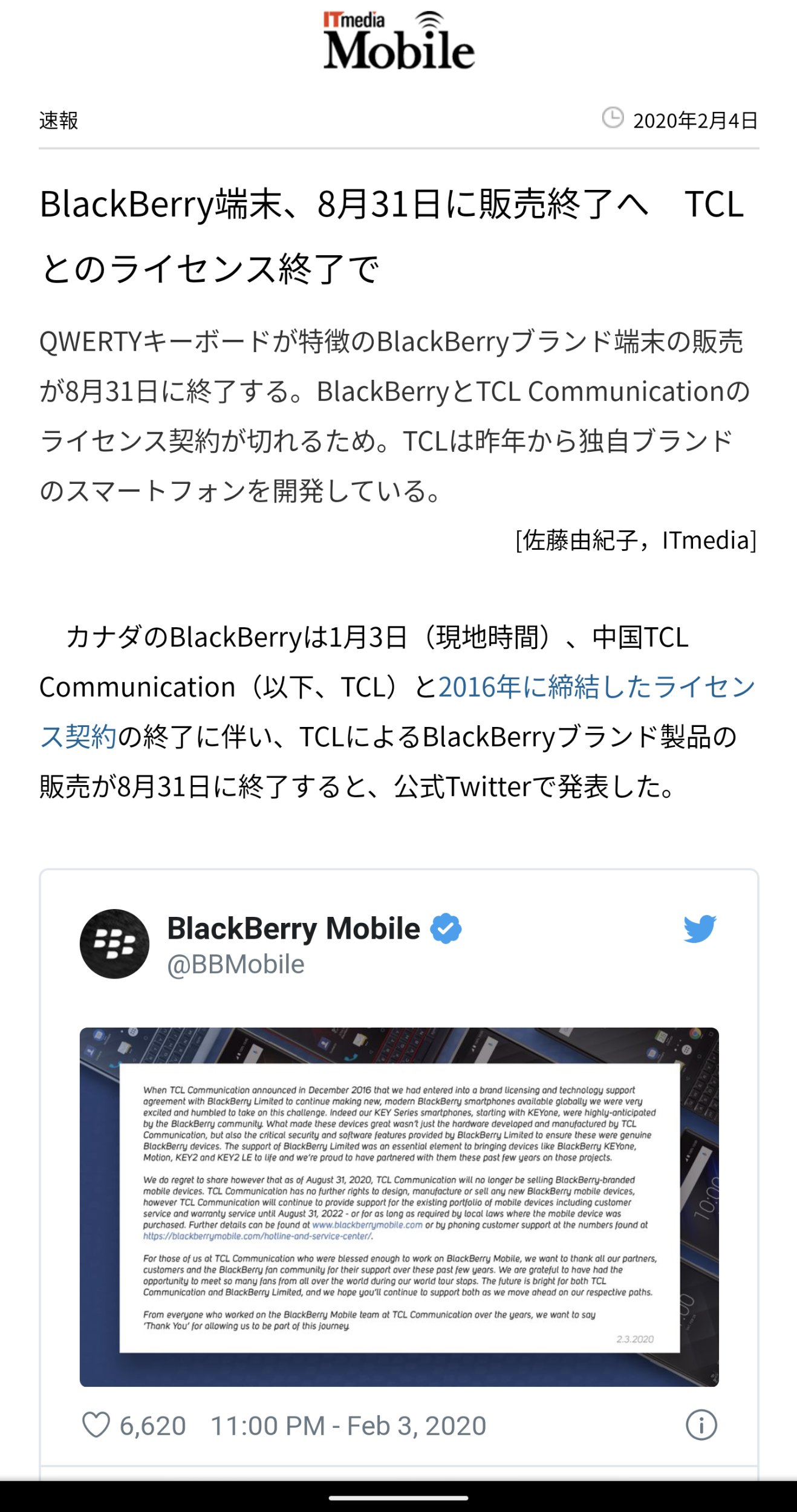 悲報中の悲報です。先日TCLが2020年8月をもってBlackBerryの生産を終了する(今後を新たなBlackBerry端末を製造しない)事を発表しました。